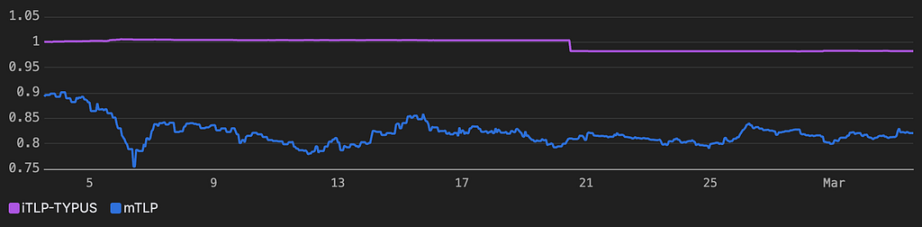 iTLP-TYPUS returned +0.06% on the week. As a 100% USDC-denominated product, its return is driven entirely by fee income and counterparty PnL — no basket exposure. The modest positive result reflects the same fee and counterparty tailwinds that benefited mTLP, though at a smaller scale.