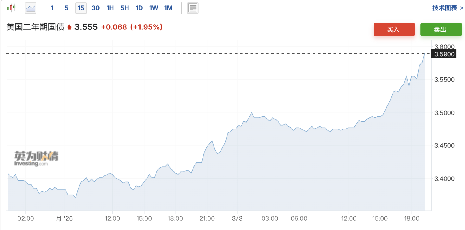 市场担忧战争会推升通胀,预计美联储今年第二次降息 25 个基点的概率已降至约 50%,而上周五交易员还在押注会有两次降息。美国两年期国债收益率一度跃升 12 个基点至 3.59%。