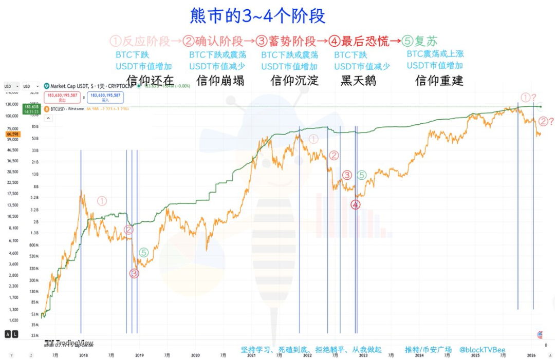 2026 年 01 月 06 日疑似开始了进入这个阶段,USDT 市值开始减少,并且市场开始各种质疑 BTC,质疑 BTC 的数字黄金属性,认为 BTC 会跌到 3 开头……